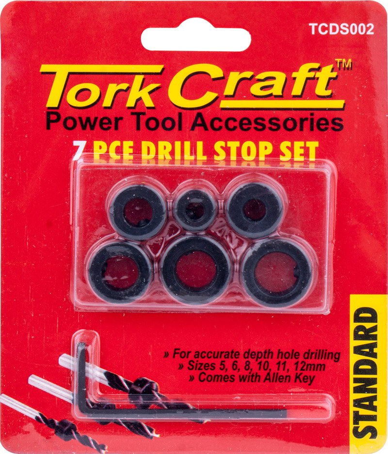 TORK CRAFT 7PC DRILL STOP SET (5.6.8.10.11.12MM) C/W ALLEN KEY